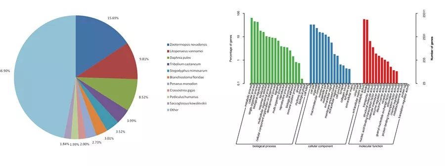 白蝦(凡納濱對蝦)是世界上養殖范圍最廣的甲殼類(lèi)動(dòng)物,其生長(cháng)迅速且抗病性強。由于白蝦基因組的高重復序列,使得其拼接錯誤率高,至今未能組裝出高質(zhì)量的基因組,同時(shí)也未對基因組的結構和功能進(jìn)行深入的研究。本文通過(guò)使用三代全長(cháng)轉錄組測序技術(shù),共獲得322,600條全長(cháng)非嵌合序列(FLNC),其中包括 51,367條高質(zhì)量全長(cháng)轉錄本。通過(guò)與數據庫比對進(jìn)行功能注釋可得,有81.72%的轉錄本注釋到Nr數據庫, Swiss-Prot、GO、COG和KEGG數據庫注釋到的全長(cháng)轉錄本比例分別為8.63%、45.38% 、32.57%和 47.83%。 此外,還鑒定到3,958非編碼RNAs (lncRNAs),其平均長(cháng)度為2,111bp,絕大多數的lncRNA長(cháng)度在300bp~4800bp。在鑒定到的80,650 個(gè)簡(jiǎn)單重復序列(SSRs)中,有17,222 (33.98%)的轉錄本包含至少一個(gè)SSR。絕大多數的SSR為單堿基重復(50.81%),其他的為雙堿基重復(27.55%)、三堿基重復(18.33%)、四堿基重復(2.41%)、六堿基重復(0.55%)和五堿基重復(0.35%) 。本研究為凡納濱對蝦提供了一套豐富的全長(cháng)cDNA序列,這將大大促進(jìn)對蝦轉錄組的研究。