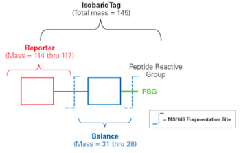 技術(shù)原理:iTRAQ標記試劑由三部分組成,報告基團、質(zhì)量平衡基團和肽反應部分,(1)報告基團:有八種,相對分子質(zhì)量分別為113、114、115、116、117、118、119和121,因此iTRAQ可同時(shí)標記8組樣品;(2)平衡部分:相對分子質(zhì)量分別為32、31、30、29、28、27、26和24,形成相對分子質(zhì)量均為145的等量異位標簽,保證iTRAQ標記的同一肽段的質(zhì)荷比相同;(3)肽反應部分:能與肽N端及賴(lài)氨酸側鏈發(fā)生共價(jià)連接而標記上肽段,幾乎可以標記所有蛋白質(zhì)。?