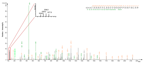 在質(zhì)譜圖中,任何一種iTRAQ試劑標記的不同樣本中的同一蛋白質(zhì)表現為相同的質(zhì)荷比。在串聯(lián)質(zhì)譜中,報告基團、質(zhì)量平衡基團和多肽反應基團之間的鍵斷裂,質(zhì)量平衡基團丟失,帶不同同位素標簽的同一多肽產(chǎn)生質(zhì)量為114,115,116和117Da(八標為113、114、115、116、117、118、119和121 Da)的報告離子(Fig.3中紅色標記),根據報告離子的豐度可獲得樣品間相同肽段的定量信息,再經(jīng)過(guò)軟件處理得到蛋白質(zhì)的定量信息。