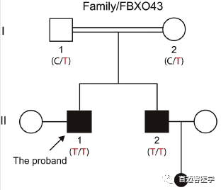 由于父母為近親結婚,首先考慮常染色體隱性遺傳模式,確定了2個(gè)具有功能喪失突變或潛在有害的錯義突變位點(diǎn)。結合基因功能分析等條件過(guò)濾后,鎖定了一個(gè)新的非同義突變FBXO43(C1991T,p.G664D)。通過(guò)Sanger測序,證實(shí)了2個(gè)兄弟存在FBXO43中的C1991T純合突變。先證者的父母攜帶雜合突變。