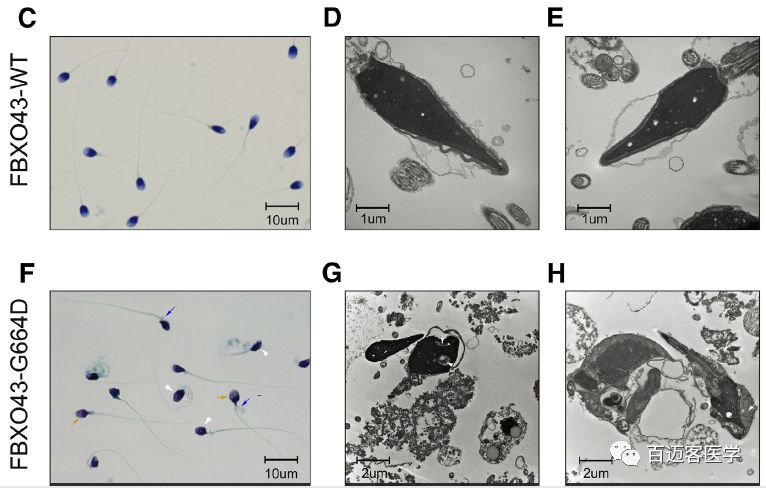 形態(tài)學(xué)分析顯示嚴重的完全畸形精子癥,主要的異常是嚴重的無(wú)定形頭,具有空泡和過(guò)剩的殘留細胞質(zhì)(圖1F)。來(lái)自?xún)尚值艿木釉陬^部出現畸形(圖1G和H)。精子呈現較大的無(wú)定形頭和腔隙染色質(zhì)缺陷(空泡),具有豐富的殘留細胞質(zhì)。