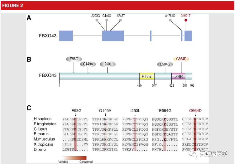 (注:該圖中除C1991T(G664D)外,其他突變?yōu)樵谏l(fā)樣本中發(fā)現的FBXO43基因突變)