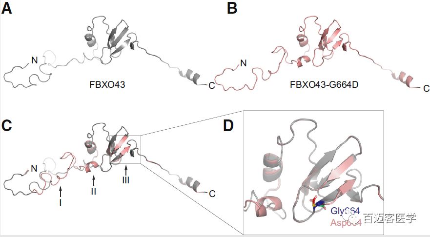 FBXO43(c.1991C>T)非同義突變導致FBXO43蛋白664殘基從非極性氨基酸(Gly甘氨酸)轉變?yōu)閹ж撾姾傻陌被幔ˋsp天冬氨酸)(G664D)。蛋白質(zhì)二級結構通過(guò)in silico結構模型預測,與野生型相比,具有2個(gè)明顯縮短的β-折疊(殘基654-668)、額外產(chǎn)生的α-螺旋(殘基610-613)和明顯變化的loop(殘基583-618)。