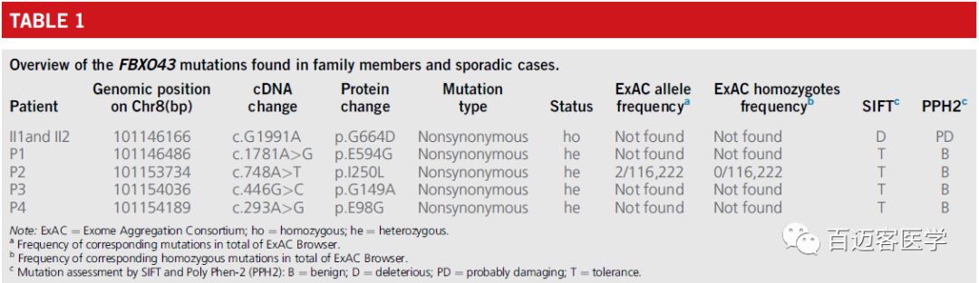 為了排除所鑒定的突變在研究群體中是常見(jiàn)突變的可能性,對來(lái)自中國200個(gè)可育個(gè)體的FBXO43外顯子進(jìn)行了突變篩查。進(jìn)行精液分析和生育有后代的200名可育人群均為甘肅省漢族人。然而,在200個(gè)對照個(gè)體中沒(méi)有發(fā)現任何致病性FBXO43突變。