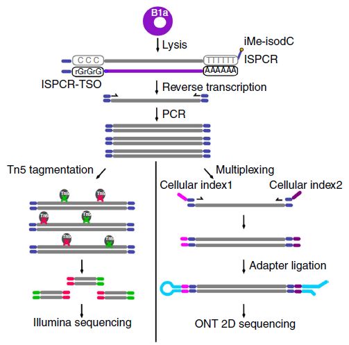 單個(gè)基因不同轉錄本isoform產(chǎn)生的蛋白質(zhì)具有不同的生物特性,包括穩定性、細胞內定位、酶活性和翻譯后修飾。Isoform是可選擇性轉錄起始位點(diǎn)(transcription start sites,TSS)、轉錄終點(diǎn)(transcription end sites,TES)和可變剪接事件等的產(chǎn)物。據預測,大部分人類(lèi)基因存在可變剪接??勺兗艚油蛔兣c人類(lèi)遺傳病和腫瘤均密切相關(guān)。故而,不僅需要在基因水平鑒定轉錄組多樣性,也需要在轉錄本表達水平分析細胞真正的轉錄多樣性。二代轉錄組測序弊端:目前基于二代平臺的短讀長(cháng)RNAseq方法在識別復雜轉錄本isoform方面存在固有限制,因為它們不能測序全長(cháng)轉錄本。相反,轉錄本被片段化以進(jìn)行測序,其產(chǎn)生的單個(gè)短reads無(wú)法跨越整個(gè)轉錄本。算法工具可用于從這些reads中組裝完整的轉錄本,但不同的組裝算法可能會(huì )導致相互矛盾的結果,整體組裝質(zhì)量良莠不齊。為了克服二代短讀長(cháng)RNAseq的這種限制,出現了基于三代測序平臺的全長(cháng)轉錄本測序,比如ONT平臺全長(cháng)轉錄組測序技術(shù)。研究表明,在看似同質(zhì)的細胞群體中各個(gè)細胞在基因表達方面可能不同。細胞間異質(zhì)性使免疫細胞成為深入分析轉錄多樣性的靶標。研究目的:通過(guò)使用ONT技術(shù)對全長(cháng)cDNA分子進(jìn)行測序,探究小鼠B1a細胞的單細胞轉錄組多樣性。
