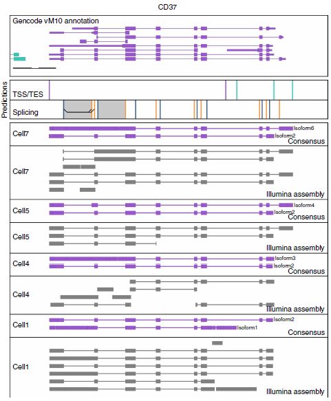 ONT全長(cháng)轉錄組測序優(yōu)于Illumina數據組裝轉錄本isoform的優(yōu)勢在于從5’端到3’端測序整個(gè)cDNA分子的能力。雖然如果基因座僅表達單個(gè)isoform,使用Trinity組裝Illumina數據可能會(huì )成功,但它似乎很難分析包含多個(gè)遠距離替代特征的基因座的多種isoform。例如,ONT RNAseq在所分析的各個(gè)細胞中鑒定了CD37基因的幾種不同isoform(上圖CD37)。在大多數情況下,從單個(gè)細胞組裝Illumina數據時(shí),Trinity無(wú)法形成完整的重疊群或產(chǎn)生ONT RNAseq未檢測到的重疊群。因此,CD37基因及其isoform鑒定突出了ONT RNAseq方法的優(yōu)勢,以確定復雜isoform多樣性,超出了短reads技術(shù)的可能性。