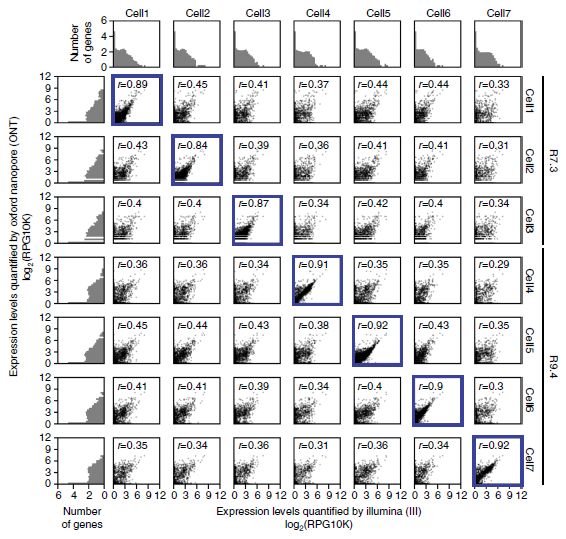 比較相同細胞的Illumina和ONT RNAseq基因表達定量結果,二者間具有高相關(guān)性(ONT R7.3芯片的Pearsonr相關(guān)系數≥0.84-0.89和升級版R9.4芯片為0.9-0.92),證實(shí)ONT RNAseq方法可復現Illumina基因表達定量。比較不同細胞中的Illumina和ONT RNAseq基因表達定量數據顯示,Pearsonr≤0.45的低相關(guān)性,表明ONT RNAseq可以鑒定不同細胞間表達差異。