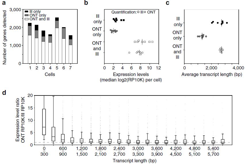 即使產(chǎn)生相對較少的reads數,ONT RNAseq基因表達定量也檢測到了絕大多數Illumina RNAseq檢測到的基因(下圖a)。此外,7個(gè)細胞中的5個(gè),基因表達檢測已達到飽和(下圖S2)。ONT或Illumina RNAseq單獨檢測到的基因表達水平較低,表明這些基因的表達水平接近兩種技術(shù)的檢測下限(下圖b)。還觀(guān)察到ONT RNAseq單獨檢測的基因由較短的轉錄本組成(下圖c)。此外,長(cháng)度<600bp并且通過(guò)ONT和Illumina RNAseq檢測的基因在Illumina RNAseq數據中具有相對較低的表達水平(下圖d)。雖然這與在基于Tn5的Illumina文庫制備中強烈選擇的較短轉錄本一致,但不能排除ONT RNAseq可能偏向于較短的轉錄本。為排除這種可能性,作者進(jìn)一步選擇合成轉錄本混合物SIRVs,分析轉錄本長(cháng)度是否對ONT RNAseq表達定量有影響。