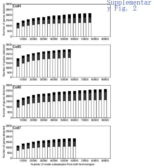 - 7個(gè)B1a細胞全長(cháng)cDNA分別進(jìn)行二代Illumina轉錄組測序(73,086-351,876 150?bp reads/細胞)和三代ONT全長(cháng)轉錄組測序(R 7.3 17,749-52,696/R9.4 57,874-128,726 ONT reads/細胞),二者間進(jìn)行比較。