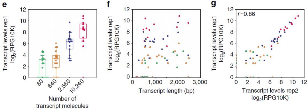 SIRV為已知長(cháng)度、結構和序列的人工合成的Spike-in RNA對照混合物。當擴增單細胞級痕量RNA時(shí),較低濃度組中的轉錄本drop-out(很多未檢出表達),并且轉錄本定量顯示每個(gè)濃度組內的變化(下圖e,橫坐標為4個(gè)不同濃度分組)。然而,重要的是,定量不受轉錄本長(cháng)度的影響,除了短于500bp的轉錄本(下圖f)。通常,ONT RNAseq定量與Spike-in?轉錄物濃度一致,轉錄本定量的組內變異在重復樣本之間是可重復的(下圖g)。這種組內變異可能是由于初始轉錄水平、系統擴增偏差或數據分析偏差導致。分析這些不同濃度的合成轉錄本使作者排除了ONT RNAseq有利于較短轉錄本定量的可能性,可對長(cháng)度為500-2,500 bp的SIRV轉錄本進(jìn)行大規模無(wú)偏倚定量。