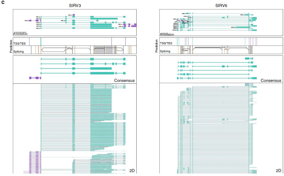 人工合成標準品?Spike-in RNA Variant Control Mixes (SIRVs, Lexogen,根據7個(gè)人類(lèi)基因結構設計而成的,其中每個(gè)基因結構有6-18種轉錄本變異,因此總共有69種轉錄本,這些轉錄本全面的解決了可變剪接、可變轉錄起始點(diǎn)和終止位點(diǎn)、重疊基因和反義轉錄問(wèn)題),分別進(jìn)行二代Illumina轉錄組測序和三代ONT全長(cháng)轉錄組測序,二者間進(jìn)行比較。