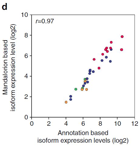 根據其TSS/TES和可變剪接位點(diǎn)的使用將ONT reads分類(lèi)為isoform組,并生成一致性序列,共計33個(gè)一致性序列,與其對應的SIRV轉錄本之間具有97.8-100%相似性,且方向一致。26個(gè)一致性序列匹配2個(gè)高豐度組中存在的29個(gè)SIRV轉錄本之一(下圖c)。不依賴(lài)于基因組注釋的轉錄本isoform?Mandalorion分類(lèi)定量與reads直接與轉錄組比對得到的定量結果之間的高度相關(guān)性(下圖d)。