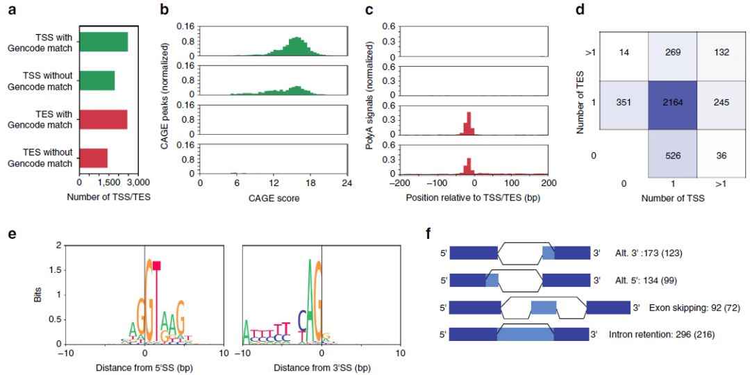 通過(guò)對ONT全長(cháng)轉錄組數據分析,鑒定到4234個(gè)TSS和3883個(gè)TES,僅有2476個(gè)TSS和2448個(gè)TES與小鼠基因組的Gencode數據庫(vM10)中存在的TSS或TES重疊。(下圖a)為了確定TSS和TES鑒定的z確性,作者分析了Fantom5數據庫中 CAGE peak和polyA信號富集,Fantom5 CAGE峰來(lái)源于轉錄本5’末端的捕獲和測序,因此應在TSS中富集。實(shí)際上,與TES(49/3883或1.3%)相比,高比例的注釋?zhuān)?356/2476或95%)和未注釋?zhuān)?052/1799或58%)TSS與高得分的Fantom5 CAGE峰重疊(下圖b)。相反,注釋和未注釋的TES都高度富集polyA信號,而TSS則沒(méi)有(下圖c)。如預期的那樣,大多數基因恰好包含一個(gè)TSS和一個(gè)TES。然而,696個(gè)基因含有1個(gè)以上的TSS或TES,表明存在一種以上的isoform(下圖d)??傊?,單個(gè)細胞ONT RNA-seq成功鑒定了數千個(gè)未注釋的TSS和TES以及數百個(gè)具有差異TSS/TES使用的基因。