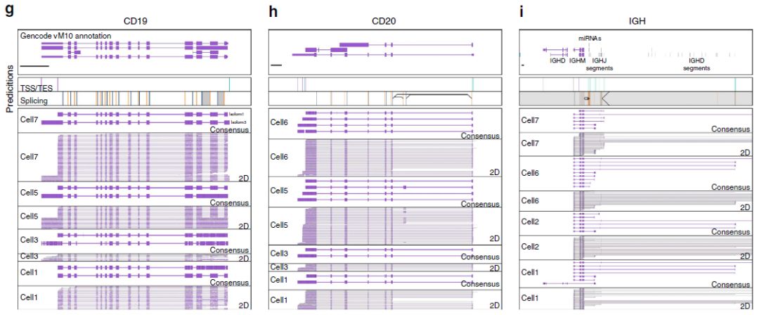 表達復雜isoform的基因定義為:含有可變TSS/TES和可變剪接位點(diǎn)的基因。共計鑒定了169種表達復雜isoform的基因。其中55個(gè)基因在細胞之間存在高度顯著(zhù)差異isoform使用,包括B細胞特異性表面受體CD19和CD20,抗體重鏈基因座(IGH)(下圖g-i),CD37(下圖CD37),以及CD2和CD79b,以及CD45。各個(gè)B1a細胞中,來(lái)自CD19的同種型顯示出可變TSS和內含子保留事件的組合。另一方面,來(lái)自CD20的同種型顯示出可選擇性TES的組合,以及包括先前未注釋外顯子的外顯子跳躍事件。IGH基因座更復雜,具有包含VDJ重組和IGHM恒定區外顯子的典型isoform。觀(guān)察到了含有IGHM恒定區外顯子的isoform,但是源自(1)流產(chǎn)性DJ重組(2)I-外顯子(3)IGHM轉換區miRNA基因座(4)J-區段。最后,細胞1中的一種isoform來(lái)自IGHM I-外顯子,但含有IGHD恒定區外顯子。雖然之前已觀(guān)察到IGH isoform多樣性并且長(cháng)期以來(lái)已知其參與類(lèi)別轉換,但ONT RNAseq在單細胞水平上測序全長(cháng)cDNA的能力確實(shí)突出并證實(shí)了?IGH基因座特殊的轉錄多樣性。