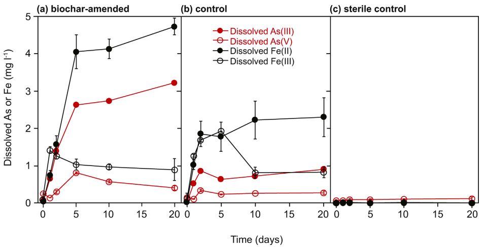 ?圖1. 不同孵育階段,生物炭修正(a)、無(wú)生物炭修正(b)和無(wú)菌(c)水稻土壤的釋放性砷As(III)/As(V)和鐵Fe(II)/Fe(III)的濃度。
