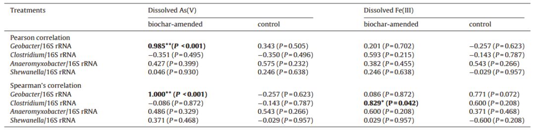 在生物炭修正組中,地桿菌(geobacter)的轉錄水平與砷As(V)的釋放濃度顯著(zhù)正相關(guān)(Pearson,R=0.98,p<0.001;Spearman,R=1,p<0.001),梭菌(clostridium)的轉錄水平與鐵Fe(III)的釋放濃度顯著(zhù)負相關(guān)(Spearman,R = 0.829 ,P < 0.05)。由此可見(jiàn),在生物炭修正的水稻土壤中,地桿菌(geobacter)和梭菌(clostridium)可以通過(guò)提高轉錄水平快速響應砷As(V) 和鐵Fe(III)的釋放。