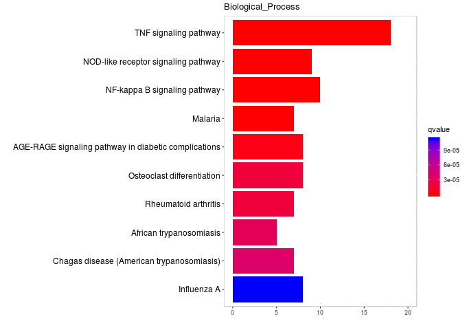 這個(gè)圖與一般的函數barplot畫(huà)出來(lái)的不一樣的地方在于它的顏色,這張圖里面的顏色反應的是fdr的大小,是一個(gè)連續值,ggplot2可以將連續值映射到到顏色上,橫坐標是通路中感興趣基因的個(gè)數。