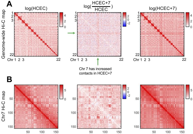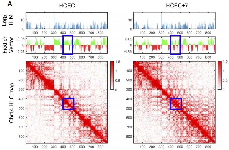 作者研究了一個(gè)正常核型的健康結腸粘膜構建的細胞系及其同源的衍生細胞系,該衍生細胞系唯一異常是有一個(gè)額外的7號染色體拷貝(47,XY,+7)。作者使用Hi-C、RNA測序和蛋白質(zhì)組分析研究了非整倍化后結構、功能的變化及其關(guān)系。7號染色體的增加導致了該染色體基因轉錄水平的增加,以及全基因組基因和蛋白表達的變化。Hi-C分析表明,7號染色體的額外拷貝反映在三倍體染色體間有更多的染色體間互作,且全基因組范圍內出現了染色質(zhì)組織的變化,包括A/B區域化和拓撲關(guān)聯(lián)域(TAD)邊界的變化。最值得注意的是,4號染色體顯示出染色質(zhì)組織的嚴重缺失,而14號染色體包含一個(gè)大的A/B?compartment轉換區域,同時(shí)其中的基因表達發(fā)生改變。間期FISH檢測染色體涂染探針距離發(fā)現額外的7號染色體區域的核位置未發(fā)生變化。此外衍生細胞系中基因和蛋白富集在惡性轉化的關(guān)鍵信號通路,如HGF/MET-axis??傊?,一個(gè)特異的染色體非整倍體對核結構和功能有重大影響,無(wú)論是局域的還是全基因組的,此研究為分析具有復雜核型的癌癥核組織提供了一個(gè)基礎。