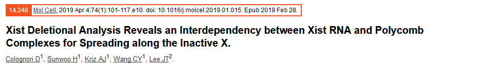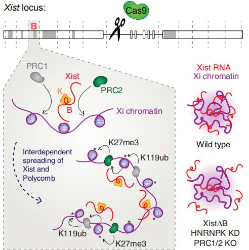 在X染色體失活期間,Xist RNA傳播包覆整個(gè)染色體,以建立沉默,但是參與傳播的功能RNA元件及機制仍未確定。作者通過(guò)一個(gè)全面的內源性Xist缺失研究,發(fā)現Repeat B 對于在Xist的傳播和多梳狀復合物1和2 (PRC1/PRC2)的作用至關(guān)重要,會(huì )影響染色體的三維結構。刪除Repeat B或其直接結合伴侶HNRNPK會(huì )影響PRC1和PRC2的招募。反過(guò)來(lái),去除PRC1或PRC2又會(huì )削弱Xist的傳播。因此,Xist和多梳狀復合物傳播包覆整個(gè)染色體時(shí)具有彼此依賴(lài)性,這三個(gè)因子對于X染色體失活至關(guān)重要,且三者是密不可分的。
