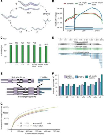 通過(guò)一系列的篩選標準,最終共計獲得2.9M 全長(cháng)reads。綜合所有階段,最終鑒定到25,944 個(gè)全長(cháng)轉錄本,其中20,987個(gè)轉錄本有唯一的可變剪接形式,16,325個(gè)轉錄本有唯一的3’UTRs ,平均每個(gè)階段鑒定到超過(guò)12,000條全長(cháng)序列。在和線(xiàn)蟲(chóng)數據庫進(jìn)行注釋比對后,有12,613 轉錄本和10,711 個(gè)基因有全長(cháng)數據支持,此外還鑒定到4,234個(gè)新基因和7,404 個(gè)新轉錄本。其中,發(fā)現9,900個(gè)已知可變剪接轉錄本和2,188個(gè)新的可變剪接轉錄本,對應1,349個(gè)基因。在這些新的剪接轉錄本中,有1,283個(gè)轉錄本在注釋的供體和受體剪接位點(diǎn)之間存在新的剪接位點(diǎn),同時(shí)173個(gè)轉錄本還存在新的外顯子。