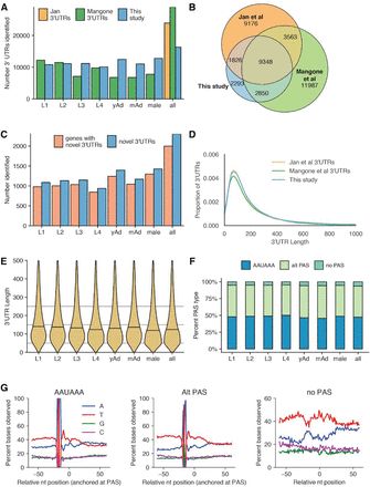 本文共鑒定到16,325個(gè)唯一的3’UTR轉錄本,在每個(gè)階段均鑒定到超過(guò)10,000 個(gè)3’UTRs。將鑒定到的3’?UTR與已知數據庫進(jìn)行比對,發(fā)現共有82.9% UTRs的重疊。此外,還鑒定到2,304個(gè)新的發(fā)現的3’?UTR。3’?UTR的長(cháng)度會(huì )隨著(zhù)階段的延續,從L1到L4,逐漸變短,在成年線(xiàn)蟲(chóng)中,雄性線(xiàn)蟲(chóng)的3’?UTR要短于雌雄同體的成蟲(chóng),而成蟲(chóng)的 3’?UTR要稍長(cháng)于L4階段的成蟲(chóng),這與前人的報道相反。通過(guò)不同階段多聚腺苷酸化位點(diǎn)統計,發(fā)現在不同階段,其位點(diǎn)不存在顯著(zhù)差異,該結果表明,不同階段3’?UTR的長(cháng)度分布與多聚腺苷化位點(diǎn)無(wú)關(guān)。