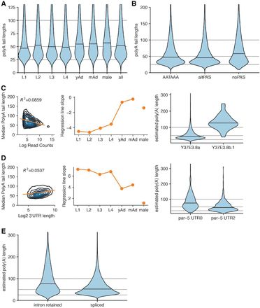 PolyA的長(cháng)度,有可能和3’?UTR區域的polyA剪接位點(diǎn)(AAUAAA)有關(guān)。為了證明該推測,本文對不同polyA剪接位點(diǎn)類(lèi)型(經(jīng)典的、可變的及無(wú)剪接位點(diǎn))的polyA尾進(jìn)行了長(cháng)度統計,發(fā)現不同類(lèi)型間存在顯著(zhù)差異,且3’UTR區域不存在polyA剪接位點(diǎn)的,具有更長(cháng)的polyA尾巴。在3’UTR區域,無(wú)polyA剪接位點(diǎn)的,其polyA長(cháng)度中位數為58 nt,具有可變polyA剪接位點(diǎn)的,長(cháng)度為46 nt;具有經(jīng)典的polyA剪接位點(diǎn)(AAUAAA),其長(cháng)度中位數為48 nt。研究表明,polyA尾的長(cháng)度與基因表達呈現負相關(guān),即高表達的基因具有更短的polyA尾。對本研究數據進(jìn)行統計發(fā)現,在幼蟲(chóng)發(fā)育階段發(fā)現有相似的負相關(guān)關(guān)系。例如,Y37E3.8基因的a轉錄本的表達要顯著(zhù)高于b.1轉錄本,其polyA尾相較于b.1更短。polyA長(cháng)度和基因表達水平的相關(guān)性R2?最高為0.1297。在成蟲(chóng)發(fā)育階段,polyA長(cháng)度和基因表達水平的相關(guān)性并不是很高。該結果表明,基因表達水平和polyA尾長(cháng)度的負相關(guān)性具有階段性。最后,本文研究了polyA長(cháng)度與內含子保留可變剪接事件的相關(guān)性。研究表明,在人類(lèi)細胞系中,polyA尾的長(cháng)度與內含子保留有關(guān)。在本文中,也發(fā)現polyA尾和內含子保留事件呈現正相關(guān)。該結果表明,polyA尾在轉錄后調控存在一種保守機制,即在核轉錄本中,其擁有更長(cháng)的polyA尾,而隨著(zhù)轉移到內質(zhì)網(wǎng)的過(guò)程中,polyA尾會(huì )進(jìn)行脫腺苷化而進(jìn)行轉錄后進(jìn)程。