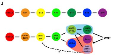 體外分化方法的最終目標是為糖尿病患者提供源自多能干細胞的β細胞而不是移植胰島。然而,應該注意到,目前實(shí)施的醫療方案涉及全胰島移植,而不是單獨的β細胞。事實(shí)上,移植單細胞類(lèi)型無(wú)法確定是否能夠重新獲得整個(gè)胰島的功能。因此,致力于在體外產(chǎn)生完整的胰島比純粹的β細胞群更有意義。文章嘗試在體外單細胞水平產(chǎn)生胰腺內分泌細胞的方法。作者通過(guò)scRNA-seq產(chǎn)生了一個(gè)無(wú)偏的大數據集,這使得能夠表征所產(chǎn)生的各種細胞類(lèi)型,它們的分化時(shí)間以及鑒定影響細胞命運的分子途徑。長(cháng)遠來(lái)看,精細調整祖細胞與內分泌命運的時(shí)間和平衡的能力可用于控制α和β細胞之間的比例,并促進(jìn)具有適當細胞組成的胰島的體外形成。