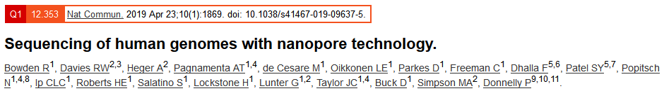 Bowden R, Davies R W, Heger A, et al. Sequencing of human genomes with nanopore technology[J]. Nature communications, 2019, 10(1): 1869.