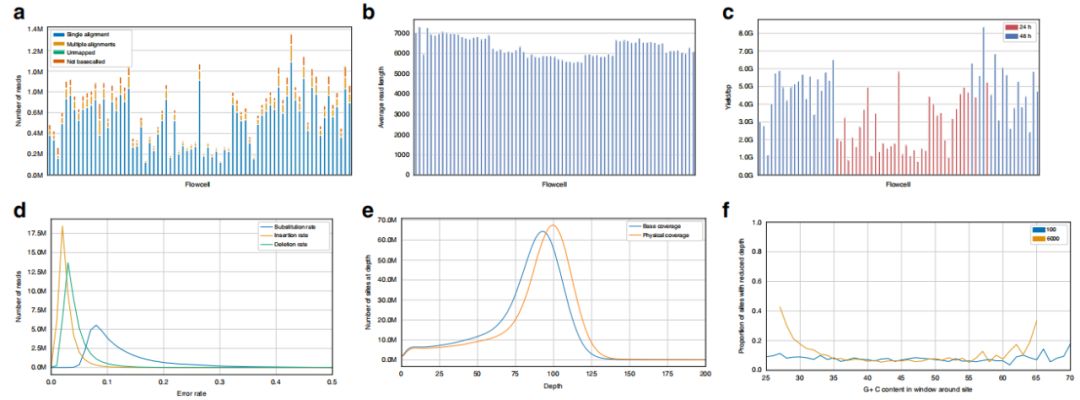 GM12878人B淋巴細胞采用PCR擴增和6kb片段篩選的文庫制備方案,共計獲得45,740,123條reads(圖1a),平均讀取長(cháng)度為6373bp(圖1b)在流動(dòng)細胞中是一致的,并且基于測序文庫的物理大小選擇非常接近預期??倲祿繛?73.4Gb,每個(gè)flow cell的平均產(chǎn)量為3.7Gb(圖1c)??傆?2,924,782個(gè)高質(zhì)量clean reads的比對率為99.3%,唯一比對率為88.8%。