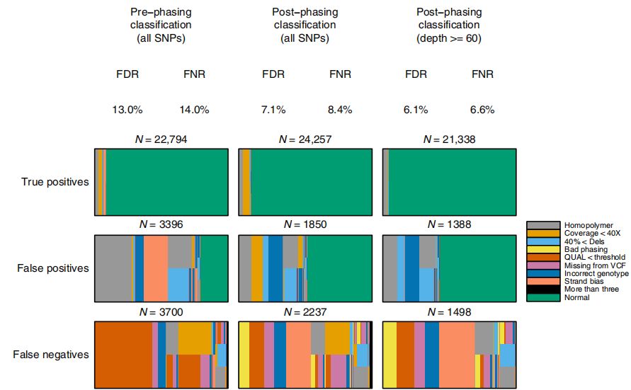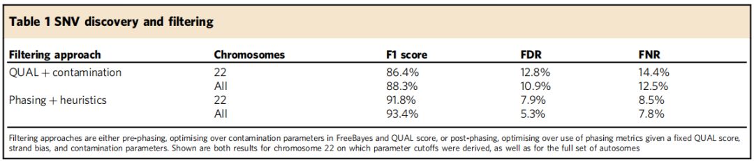 使用過(guò)濾器改進(jìn)變異檢測,通過(guò)phasing和注釋過(guò)濾器(Post?phasing classification)顯著(zhù)改善變異檢測,*佳結果F1評分為92.2%,FDR為7.1%,FNR為8.5%(表1,圖2中)。進(jìn)一步考慮覆蓋深度>=60X的假定變異位點(diǎn)(基因組的85%)時(shí),觀(guān)察到F1得分改善至93.6%,FDR為6.1%,FNR為6.6%(圖2右),這意味著(zhù)減少或消除覆蓋深度偏差源(如PCR)的操作改進(jìn)在提高z確性方面可以發(fā)揮一定作用。(百邁客目前ONT全基因組重測序和ONT全基因組甲基化測序建庫過(guò)程正是PCR-free建庫–direct-DNA建庫,一是可減少覆蓋深度偏好,有利于提高變異檢測z確度;二是可以保留堿基修飾信息,同時(shí)檢測甲基化修飾等信息)