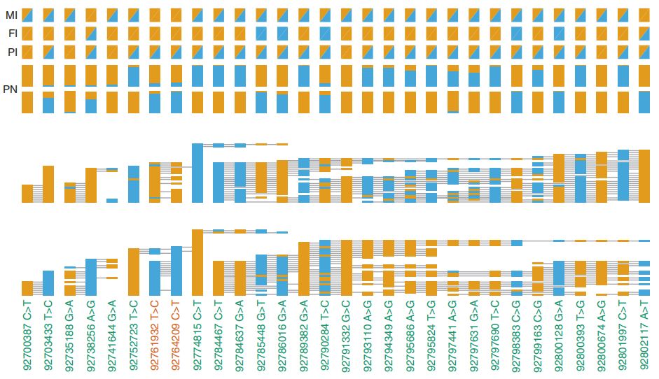 注:前3行為未定相母親(MI),父親(FI),先證者(PI)基因型,第4行為先證者單倍型Phased proband genotypes (PN)。藍色=alt ,橙色=ref。PN下面2行為單倍型1(母系遺傳)或單倍型2(父系遺傳)對應的reads,其中對于每條read,堿基是矩形,reads跨度以水平線(xiàn)顯示。間隙代表gap(缺失)。底部顯示物理位置,感興趣的位點(diǎn)為紅色?;贕RCh37 NM_152703.3, 92761932 T>C對應于c.3353 A>G,92764209 C>T對應于c.1076 G>A。