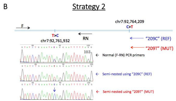 不出所料,ONT數據也鑒定到了具有預期雜合基因型的c.1076 G> A和c.3353 A> G變異。使用ONT reads對其他附近變異進(jìn)行定相,以確認新生變異的遺傳和來(lái)源(圖3)。這2個(gè)新生突變被定相于一個(gè)199kb的block內,33條reads(6.1-18.9kb)跨越2個(gè)新生突變位點(diǎn),11條reads包含新生突變等位基因,8條reads包含2個(gè)參考等位基因,表明突變的等位基因是順式的(來(lái)自于同一條染色體)。(NA12878數據中沒(méi)有reads跨越包含2個(gè)位點(diǎn)的突變等位基因。)使用一系列等位基因特異性PCR實(shí)驗證實(shí)來(lái)自ONT reads的新生等位基因的單倍型構象。相位區中的側翼位點(diǎn)表明,父系遺傳的單倍型出現了新生變異(圖3)。