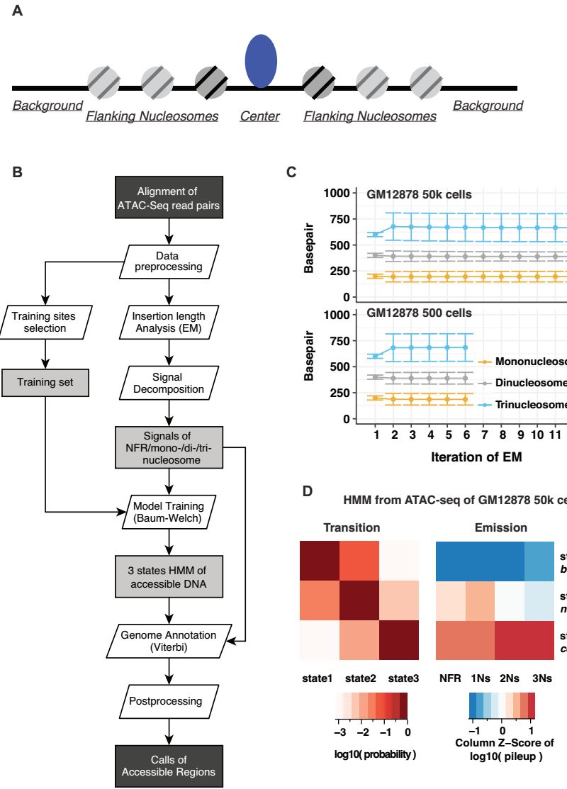 因此,作者提出了針對ATAC-seq數據的分析工具,HMMRATAC,一種基于半監督機器學(xué)習方法。?HMMRATAC軟件的主要思想是decomposition and integration(分解和集成),首先將單個(gè)ATAC-seq數據集分成無(wú)核小體(nucleosome-free regions, NFR)和核小體富集信號,用隱馬爾科夫模型(HMM)訓練開(kāi)放區域周?chē)毺氐娜旧|(zhì)結構,然后預測整個(gè)基因組中的開(kāi)放區域。?該方法利用了ATAC-seq數據的獨特特征來(lái)識別的染色質(zhì)的結構更準確。