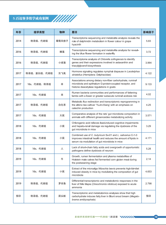 百邁客致力于將好的技術(shù)提供給科研者。代謝組服務(wù)現已細分服務(wù)內容,涉及非靶向代謝組,脂質(zhì)非靶向代謝組,靶標代謝組,植物高通量靶標,動(dòng)物高通量靶標,花青素高通量靶標,游離脂肪酸高通量靶標,氨基酸高通量靶標等。目前,百邁客已經(jīng)協(xié)助發(fā)表大量多組學(xué)聯(lián)合文章,涉及到轉錄組 & 代謝組、微生物多樣性 & 代謝組,轉錄組 & 微生物多樣性 & 代謝組。點(diǎn)擊這里下載“百邁客生物代謝組成功案例>>百邁客生物代謝組成功案例