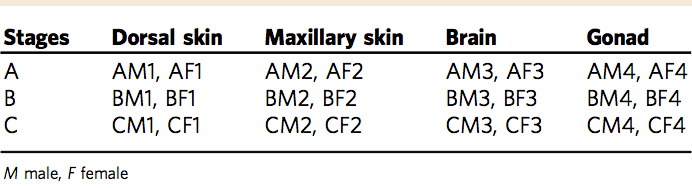 轉錄組學(xué)分析:亞成年期、繁殖期、繁殖后期雌性及雄性的上頜皮膚、背部皮膚、腦、性腺組織(圖1)