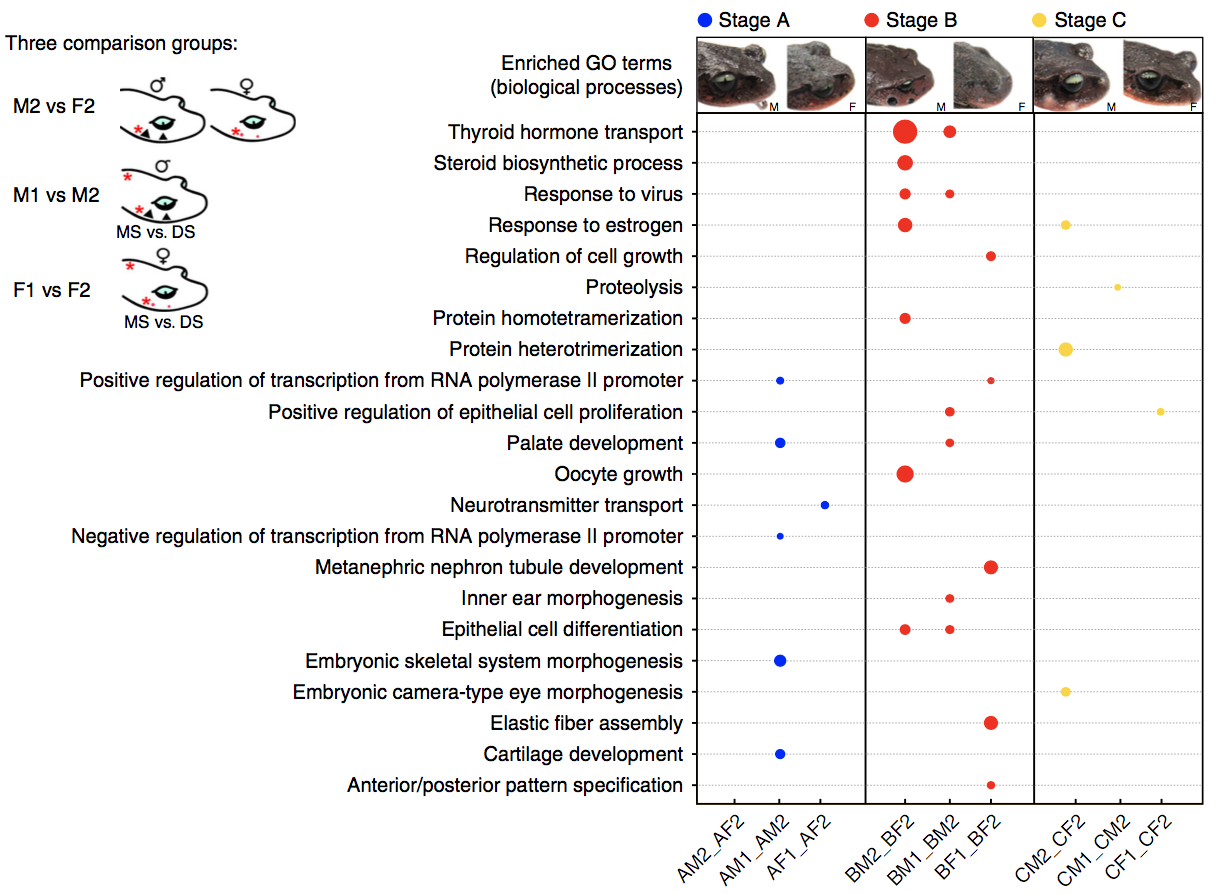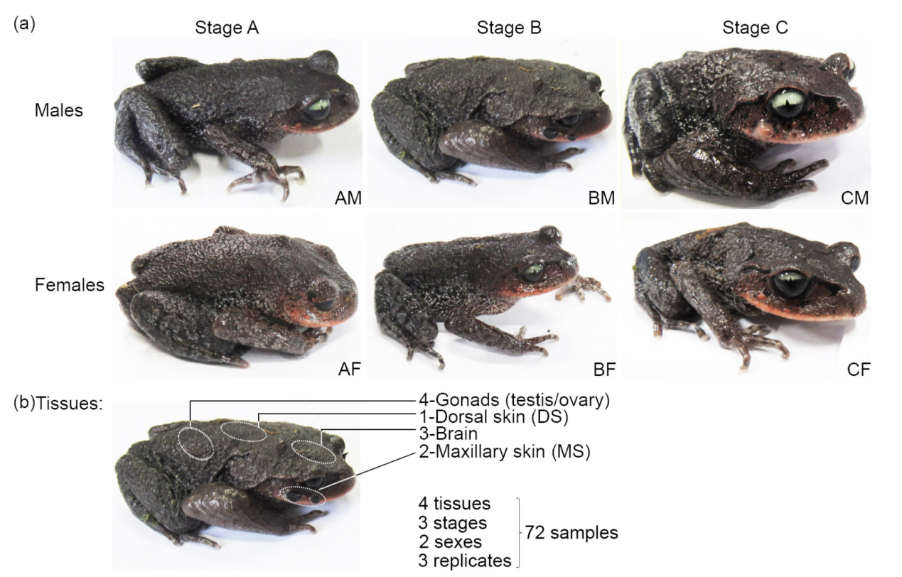 在雌雄異體的有性生物中,兩性之間在體型大小、形態(tài)結構和功能等方面存在明顯差異的現象稱(chēng)為性二態(tài)(Sexual dimorphism)。自然界普遍存在的性二態(tài)(如劍尾魚(yú)的劍狀尾和獅子的鬃毛等)一直是進(jìn)化生物學(xué)家關(guān)注的熱點(diǎn)問(wèn)題。兩棲動(dòng)物具有豐富的性二態(tài)特征,繁殖期的雄性雷山髭蟾在上頜的皮膚形成角質(zhì)刺,類(lèi)似于人類(lèi)的“胡子”,因此又被稱(chēng)為“胡子蟾”,繁殖期過(guò)后,角質(zhì)刺外殼會(huì )脫落,而雌性則沒(méi)有這種特征。由于除了性染色體上的基因外,大多數的基因組在雄性和雌性之間是共享的,所以性二態(tài)往往是由基因在性別間差異性表達引起的。由于缺乏參考基因組,很少有研究能夠將性別差異表達模式與特定的性二態(tài)特征聯(lián)系起來(lái),與性二態(tài)性狀相關(guān)的重要生物學(xué)過(guò)程和關(guān)鍵基因也一直難以破解。本文成功的建立了一個(gè)具有代表性的鋤足蟾亞目基因組,并對其皮膚來(lái)源的性二態(tài)性狀進(jìn)行了分子基礎的研究。