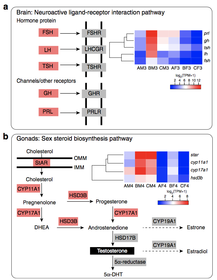 為了探討L.?leishanense中角質(zhì)刺的激素調節,研究者對來(lái)自大腦和性腺的轉錄組數據進(jìn)行了測序(表2)。研究發(fā)現B期雄性和雌性之間的DEGs(BM3-BF3)和A期和B期雄性之間的DEGs(AM3-BM3)中的神經(jīng)活性配體-受體相互作用途徑顯著(zhù)富集,在這些基因中,LH(黃體生成素)和FSH(卵泡刺激素)編碼肽激素,通過(guò)血液進(jìn)入性腺刺激類(lèi)固醇激素的合成(圖9)。相關(guān)基因的表達表明雄性在繁殖季節中下丘腦-垂體-性腺軸的激活。雄性精巢在不同時(shí)期的類(lèi)固醇激素生物合成途徑顯著(zhù)豐富。在這條途徑中,編碼參與性類(lèi)固醇生物合成的酶的基因在B期雄性精巢中高度表達(圖9),表明B期雄性精巢中雄激素(睪酮和5α-DHT)生物合成水平較高。