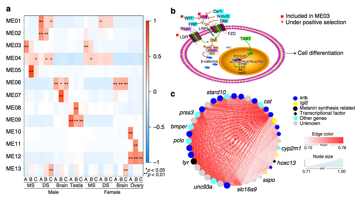 轉錄組基因預測:腦、精巢、肝、心、腎、脾、肌肉、上頜皮膚(MS)、背部皮膚(DS)