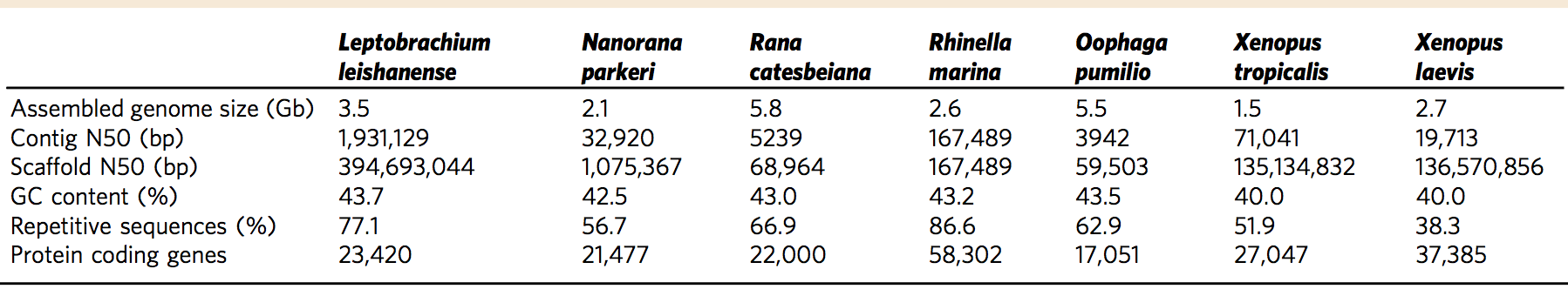 表1 雷山髭蟾與其它無(wú)尾目物種基因組比較