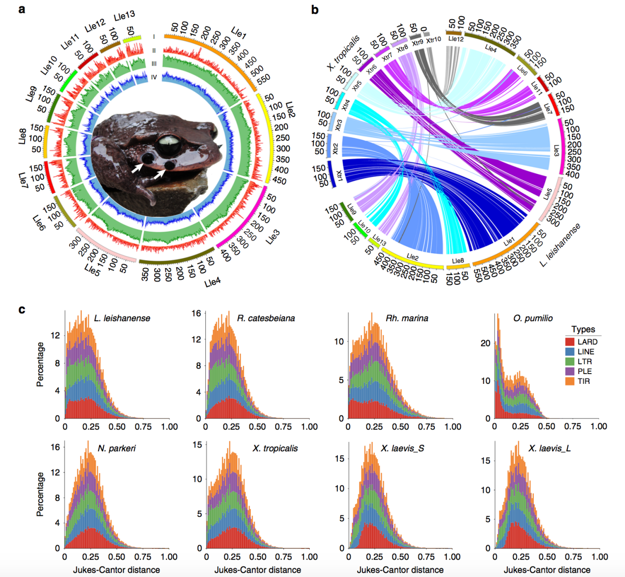 通過(guò)基因組共線(xiàn)性研究雷山髭蟾L. leishanense和熱帶爪蟾?X. tropicalis的基因組結構特征。結果表明,兩個(gè)物種之間存在著(zhù)大量的染色體共線(xiàn)性(圖4 b)。L. leishanense染色體數目是13,而?X. tropicalis的染色體數目是10,這種差異是源于L. leishanense的染色體分裂。X. tropicalis染色體(Xtr)4、7和8上的同源共線(xiàn)性區段分布在L. leishanense基因組中的兩個(gè)獨立染色體上(分別為L(cháng)le8+10、6+11和9+13)。在L. leishanense的基因組中,346個(gè)共線(xiàn)性區段中有179個(gè)倒位。經(jīng)PacBio reads驗證,X. tropicalis的Xtr2、3、6、9、10等7個(gè)區域(502 Kb-5.9 Mb)易位到與相應同源染色體不同的L. leishanense染色體上(圖5)。