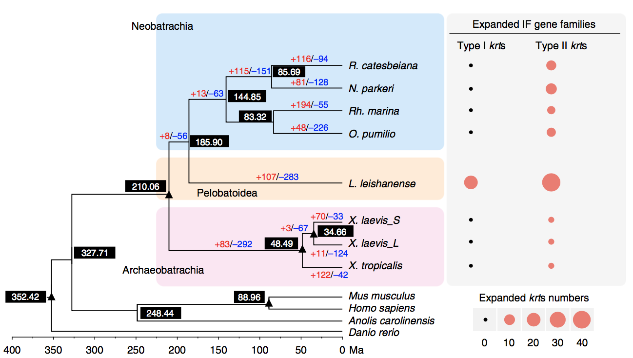 通過(guò)單拷貝直系同源基因進(jìn)行進(jìn)化樹(shù)的構建,七個(gè)無(wú)尾目物種最近的共同祖先(MRCA)估計發(fā)生在2.101億年前(176.2-248.8 Ma),L. leishanense與新蛙亞目的物種在約185.9 Ma發(fā)生分化(圖6)。與MRCA相比,L. leishanense共有107個(gè)基因家族顯著(zhù)擴張(圖6),擴張家族的基因主要富集于信號反應類(lèi)型,包括嗅覺(jué)、刺激反應和信號轉導。與細胞增殖、凋亡和存活等多種細胞功能的調節和對細胞外刺激的反應中起重要作用的PI3K-Akt信號通路在L. leishanense中顯著(zhù)擴張。與免疫反應相關(guān)生物過(guò)程相關(guān)基因發(fā)生顯著(zhù)且特異性的擴張。還需要進(jìn)一步的分析和實(shí)驗數據來(lái)探討其生境適應與免疫應答相關(guān)基因擴張的關(guān)系。