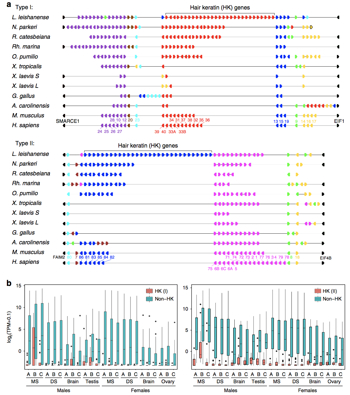 圖7 角蛋白基因家族的基因組分布和表達模式