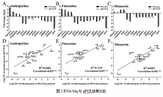 作者為了更好地了解不同種類(lèi)抗抑郁藥誘導的毒性反應在非靶向魚(yú)類(lèi)中的作用機制,用分屬于不同抗抑郁藥物類(lèi)別的阿米替林(Amitriptyline hydrochloride)、氟西?。‵luoxetine hydrochloride)和鹽酸米安色林(mianserin hydrochloride)對早期發(fā)育階段的斑馬魚(yú)胚胎進(jìn)行處理,然后進(jìn)行了轉錄組測序(RNA-Seq),基于前面轉錄組的分析結果,作者采取兩組qPCR驗證實(shí)驗: