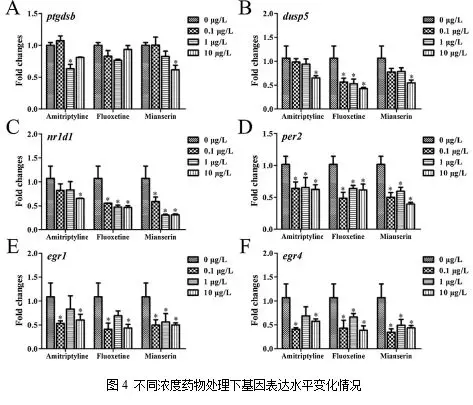 作者用三種不同濃度的抗抑郁藥(0.1、1和10 μg /L)處理斑馬魚(yú)胚胎,應用qPCR試驗確定6個(gè)選定的基因的濃度—應答關(guān)系。結果表明,ptgdsb的mRNA水平只在1 μg /L阿米替林和10 μg /L米安色林處理組顯著(zhù)降低;而dusp5表達水平在10 μg /L阿米替林和米安色林處理組以及所有氟西汀處理組中均顯著(zhù)降低;除了在1和10 μg /L阿米替林處理組中的nr1d1表達水平未受抑制之外,nr1d1和per2在幾乎所有抗抑郁藥物處理組均受到顯著(zhù)抑制。此外,兩個(gè)與早期生長(cháng)應答相關(guān)的基因egr1和egr4在0.1和10 μg /L阿米替林處理組和所有米安色林處理組中表達下調,egr4在所有氟西汀處理組降低,而egr1只在0.1和10 μg /L氟西汀處理組中表達降低(圖4)。