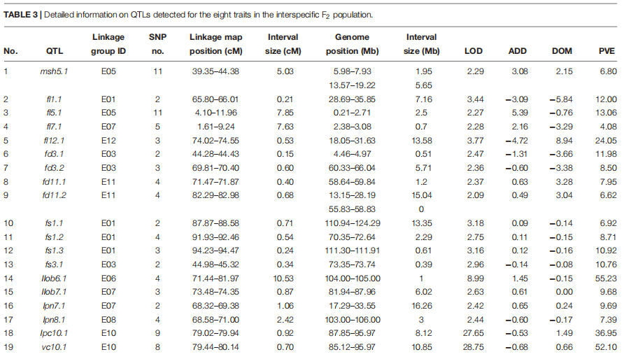 FD定位到4個(gè)QTL,分別位于LG3與11上,QTL貢獻率分別為fd3.1(11.98%)、fd3.2 (8.50%)、fd11.1 (7.95%)與fd11.2 (6.62%)。每個(gè)QTL的遺傳距離為0.15-0.68 cM.;fl12.1與fd3.2存在部分重疊,fd11.1與fd11.2分別跨越Chr11:71.47-71.87 cM and 82.29-82.98 cM。并且每個(gè)QTL包含的SNP數目為2-4個(gè)。