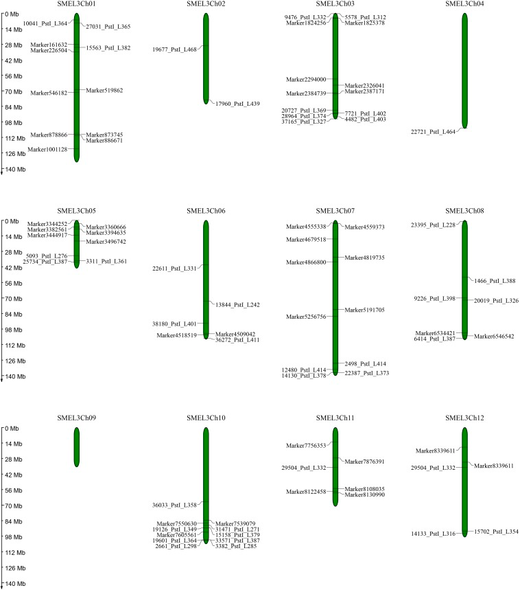 FIGURE 3 | Graphic view of the distribution of markers associated with related traits on eggplant chromosomes.