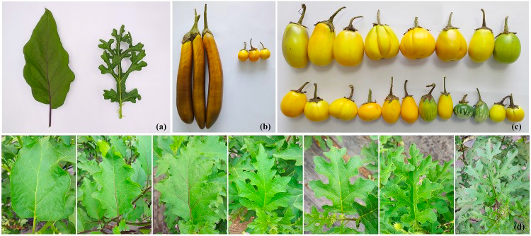 圖1. Fruit and leaf morphology of the two eggplant parental lines and the F2 population. (a) Leaves of Solanum linnaeanum “1809” (right) and S. melongena “1836” (left); (b) mature fruits of “1809” (right) and “1836” (left); (c) mature fruits of the representative F2 individuals; (d) leaves of the representative F2 individuals.