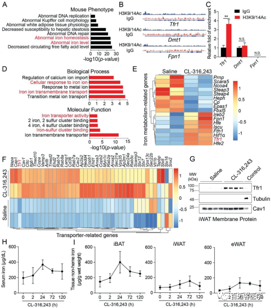 本研究首先利用Chip-seq (Fig 1A/B)、RNA-seq(Fig 1D/E)、蛋白組三種技術(shù)手段,從轉錄調控、mRNA、蛋白質(zhì)三個(gè)不同層面發(fā)現在實(shí)驗組(C57BL/6J mice)中與鐵轉運相關(guān)的啟動(dòng)子 、基因、蛋白均有明顯的富集。為了驗證結果的準確性,對與鐵轉運相關(guān)的啟動(dòng)子進(jìn)行用Chip-qPCR(Fig 1C)的方法驗證,對鐵轉運相關(guān)的蛋白做了WB驗證(Fig 1G),結果都顯示Tfr1基因在實(shí)驗組(C57BL/6J mice)中的表達量明顯增加。綜上所述,Tfr1基因在CL-316,243處理的小鼠中Tfr1基因對鐵穩態(tài)起著(zhù)至關(guān)重要的作用。
