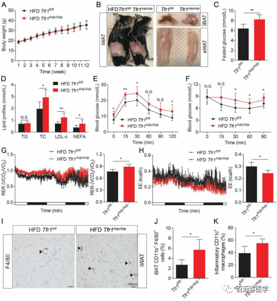 為了進(jìn)一步探究Tfr1基因在棕色/米色脂肪細胞的發(fā)育和產(chǎn)熱能力維持的過(guò)程的作用機制。分別對Tfr1Adp/Adp和Tfr1fl/fl 進(jìn)行高脂肪、正常喂養,并對4組樣本分別進(jìn)行葡萄糖耐量、胰島素抵抗、呼吸速率、能量消耗、CD11b+F4/80巨噬細胞、CD11c+巨噬細胞的比例等實(shí)驗。數據表明在高脂肪處理實(shí)驗組 中,整體體重(Fig3 A)、白色脂肪組織(Fig3 B)大小都沒(méi)有明顯的差異。然而在高脂實(shí)驗組中棕色脂肪組織完全轉化為白色脂肪組織(Fig3 B)。同時(shí)小鼠空腹血糖、血脂、非酯化脂肪酸脂肪酸的含量明顯高于高脂對照組。高脂喂養后,盡管血液中血糖含量沒(méi)有太大的變化,但是驗組中葡萄糖耐量、胰島素抵抗的值都要高于高脂對照組(Fig3E/F)。這說(shuō)明高脂實(shí)驗組中糖耐受性受損可能是導致空腹血糖升高的原因。而呼吸速率、能量消耗的實(shí)驗表明缺失Tfr1基因后呼吸速率會(huì )增加,能量消耗能力降低(Fig3G/H)。在正常喂養的實(shí)驗組中白色脂肪組織相對于正常對照組來(lái)說(shuō)明顯減少。 上述數據表明,能量消耗降低并沒(méi)有導致高脂喂養實(shí)驗組小鼠體重增加,可能是由于Tfr1缺失對白色脂肪細胞的內在的影響。