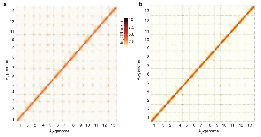 兩版亞洲棉基因組Hi-C熱圖比對(左舊;右新)